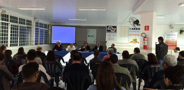 Foto 01 – Mesa Diretora dos Trabalhos (da esquerda para direita): Coordenadora do GT Meio Ambiente do CAU/SP Arqtª e Urbª Mirtes Luciani; Gerente de Gabinete da Presidência do CAU/SP, Arqtº e Urbª José Eduardo Tibiriçá; Vice-presidente do CAU/SP, Valdir Bergamini; Presidente da AERO, Eng. Agrônomo Antonio Carlos Caetano; Vereador Cido do Sindicato representando a Câmara Municipal de Ourinhos.